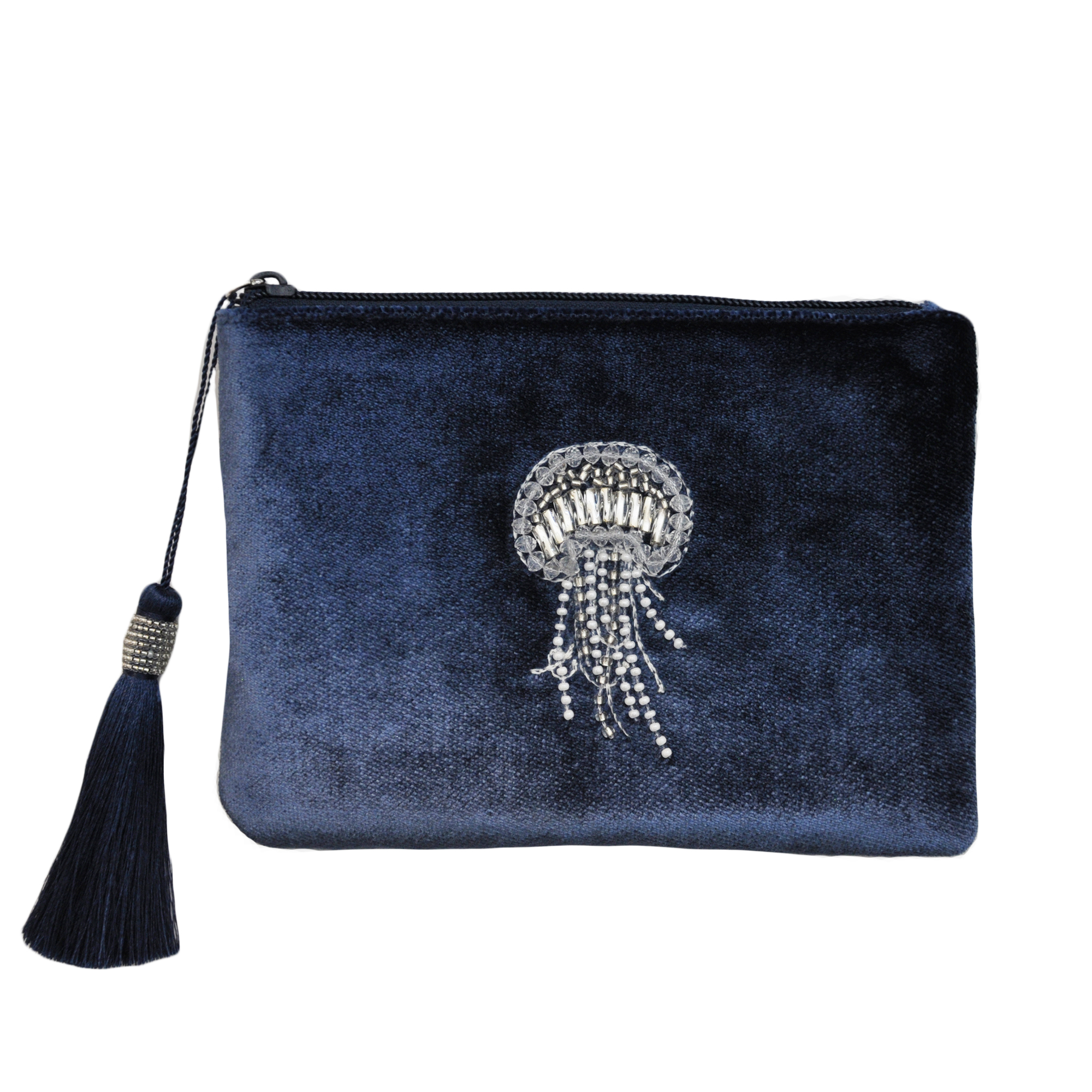 The Dancing Jellyfish pouch is delicately hand-embroidered by our craftspeople. It is adorned with pearl patterns that evoke the diversity of the seabed. It is ideal for travelling elegantly.